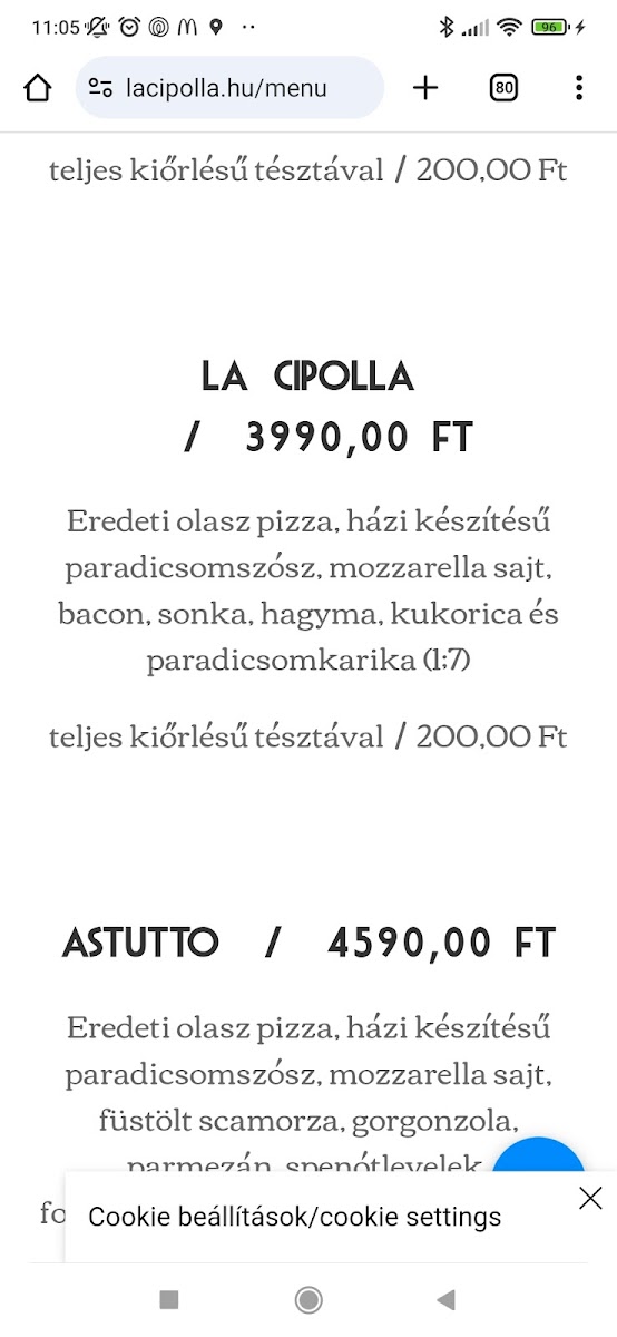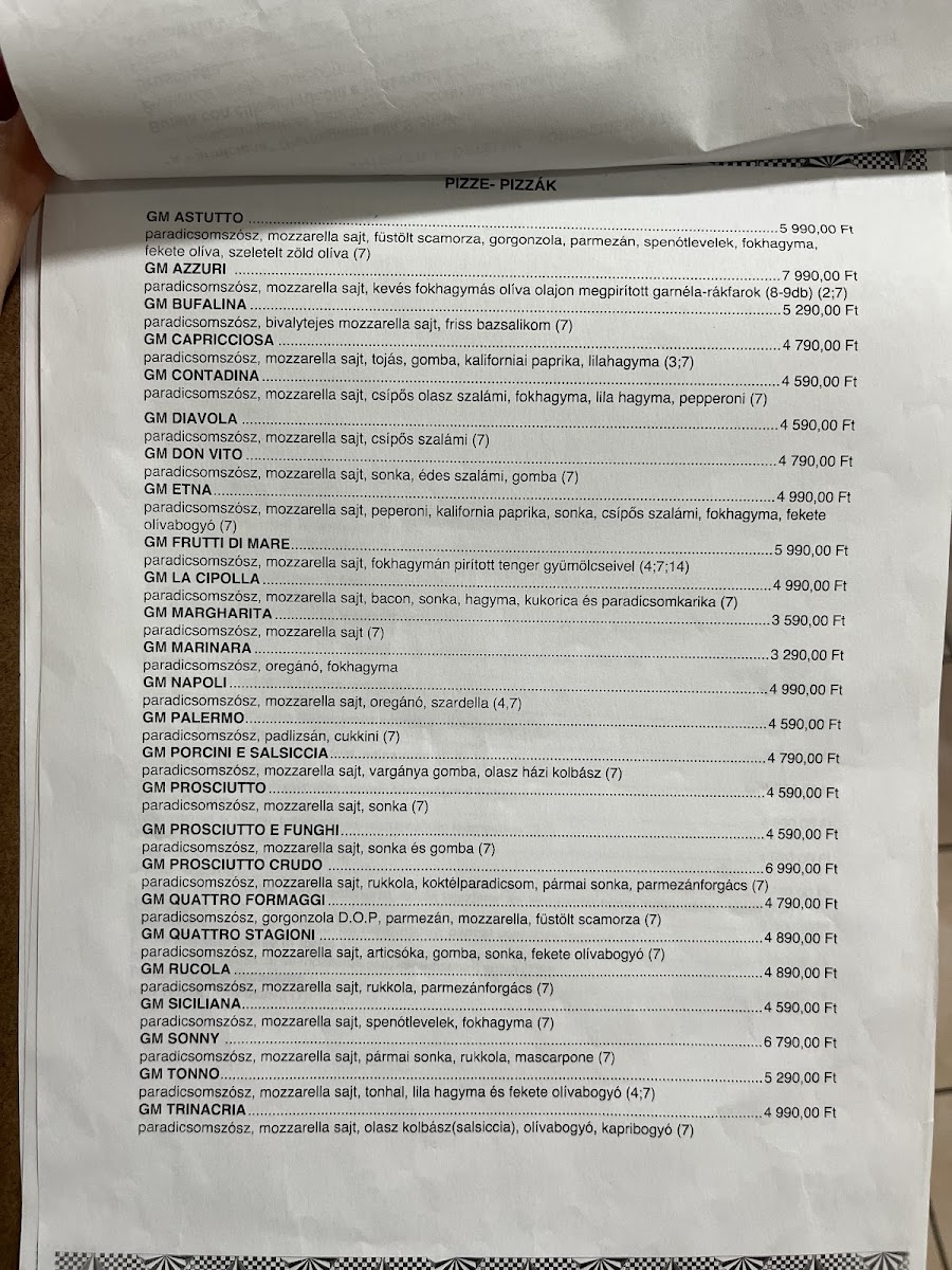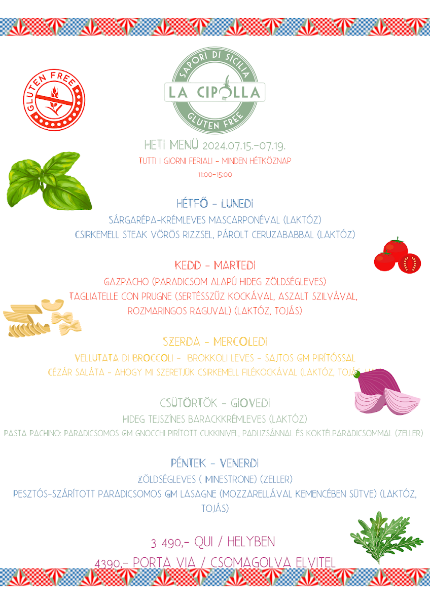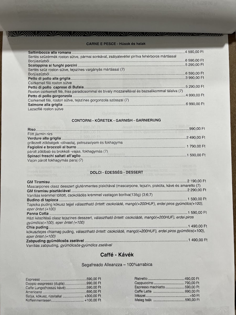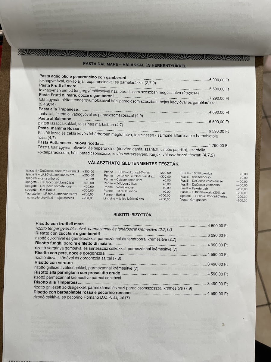 La Cipolla - Gluten-Free offers an extensive and diverse menu, perfect for those seeking flavorful gluten-free options. Their pasta selection includes tempting choices such as Pasta Al Pistacchio E Gamberi, GM Pasta Frutti Di Mare, and GM Pasta Alla Trapanese, all showcasing fresh seafood. For risotto lovers, the restaurant features dishes like GM Risotto Con Frutti Di Mare and GM Risotto Alla Parmigiana Con Prosciutto Crudo, which offer a variety of tastes from seafood to savory ham. The salad options are equally enticing, with choices like GM Insalata Verde Grandi, Insalata Di Pollo E Avocado, and GM Insalata Tonno providing a light and healthy alternative. For a hearty main course, guests can try GM Petto Di Pollo Alla Griglia or the rich GM Saltimbocca Alla Romana. Pizza lovers can enjoy gluten-free pizzas like GM Pizza Azzurri or GM Pizza Porcini E Salsiccia, with classic and bold flavor profiles. The drink menu features a selection of hot beverages such as Decaffeinato Cappuccino and Americano, along with refreshing soft drinks like San Pellegrino Melograno & Arancia and XIXO Ice Tea in various flavors. For dessert, indulge in treats like Vaníliás Zabpuding Erdei Gyümölcs-Zselével and GM Panna Cotta. With a variety of gluten-free dishes that cater to all tastes, La Cipolla ensures an enjoyable dining experience for every guest.