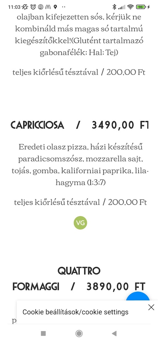 Gluténmentes lisztből készült pizza házi készítésű paradicsomszósszal, gorgonzola D.O.P sajttal, parmezán sajttal, mozzarella sajttal és füstölt scamorza sajttal (allergének: tej)