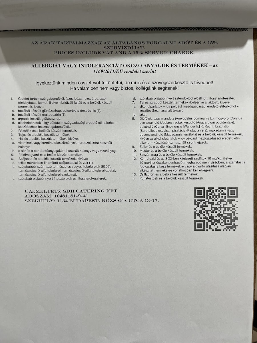 Gluténmentes. Jégsaláta, saját készítésű cézáröntet (tojássárgájából mustárral és olajjal hagyományos majonézt keverünk, kevés tejszínnel, kapribogyóval és szardellával dúsítjuk, egy csipet só és fehérbors, majd megkínáljuk egy kis olaszrizlinggel végül a salátához keverjük) gluténmentes grisinivel és parmezán sajtforgáccsal tálaljuk (allergének: tojás, tejtermék, hal, mustár, minimális alkoholt tartalmaz)